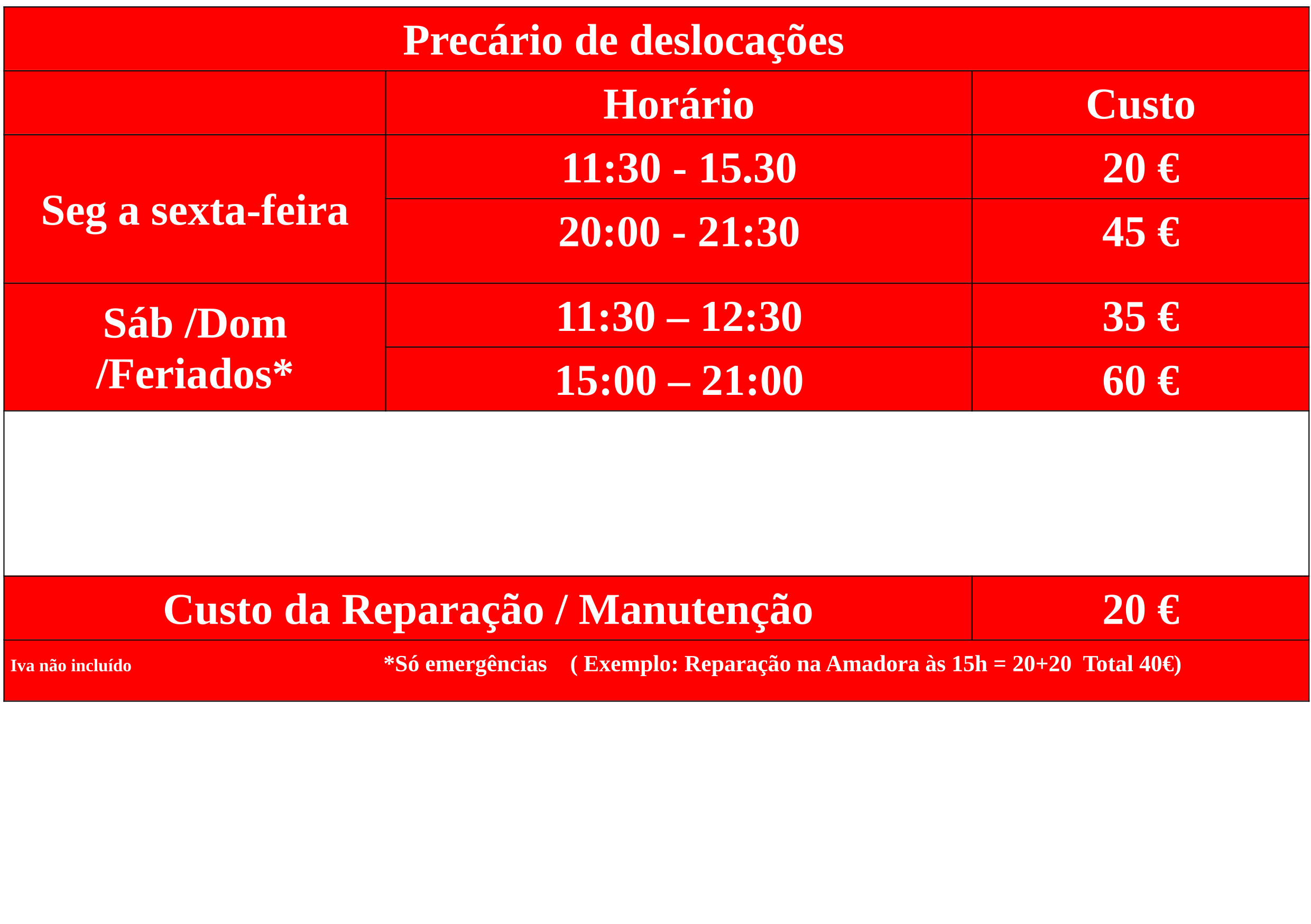 Esta tabela é referente ás zonas de Amadora, Lisboa, Oeiras, Loures, Queluz e não inclui peças caso seja necessário. ( Outras localidades, consultar)